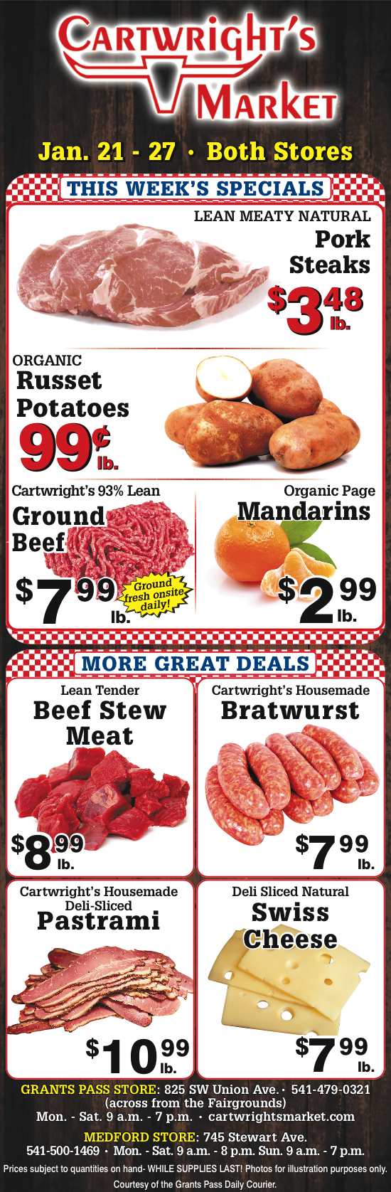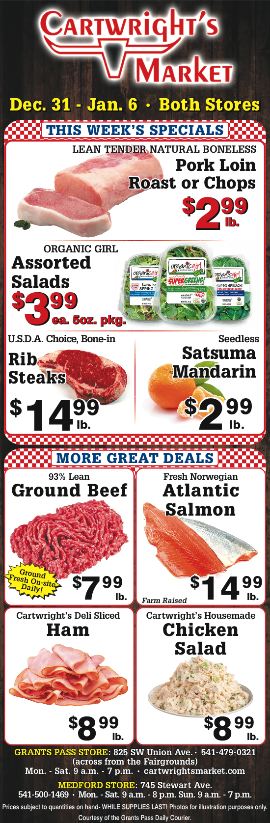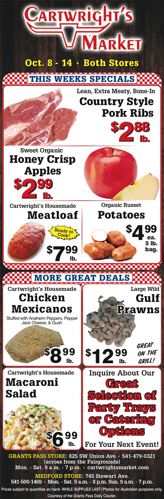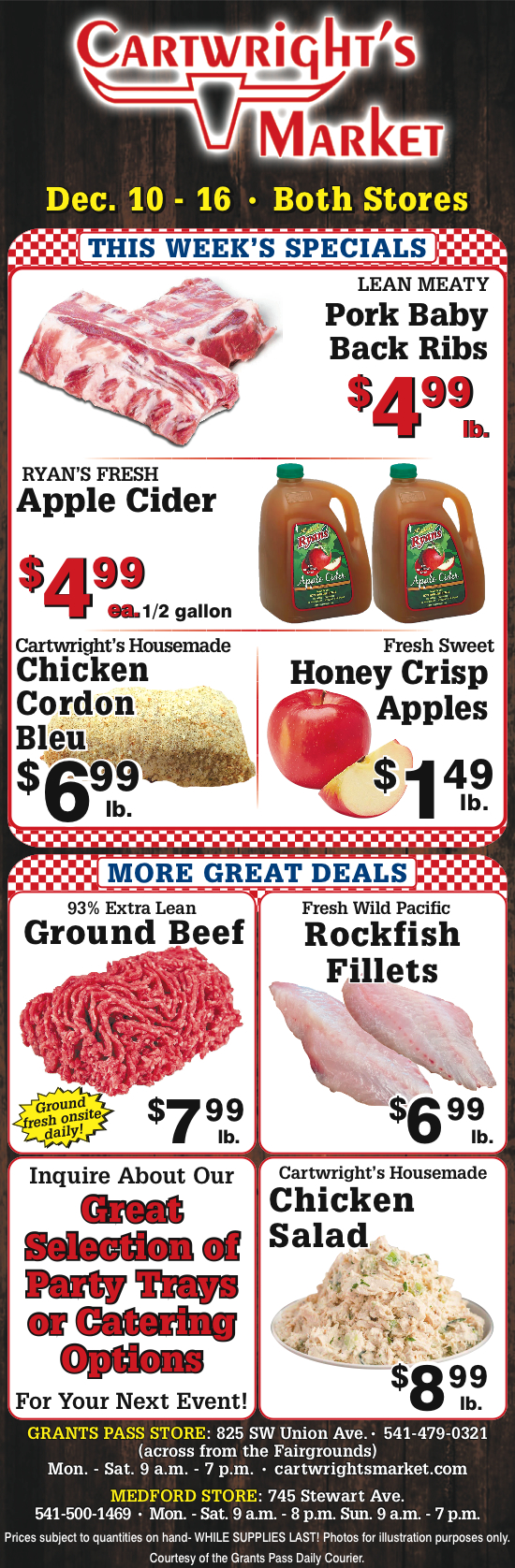 Cartwright’s Market is a leading fresh meat, produce and specialty market in Grants Pass, OR. We offer a wide variety of the freshest beef, pork, chicken and smoked meats in our 64-foot meat case. We also offer delicious, fresh seafood that is perfect for any occasion.