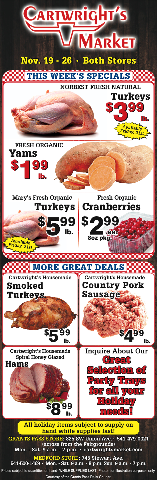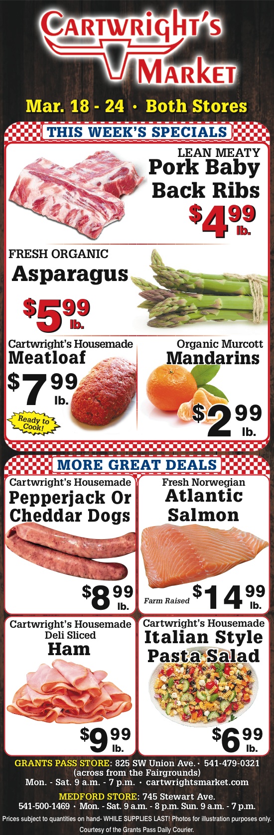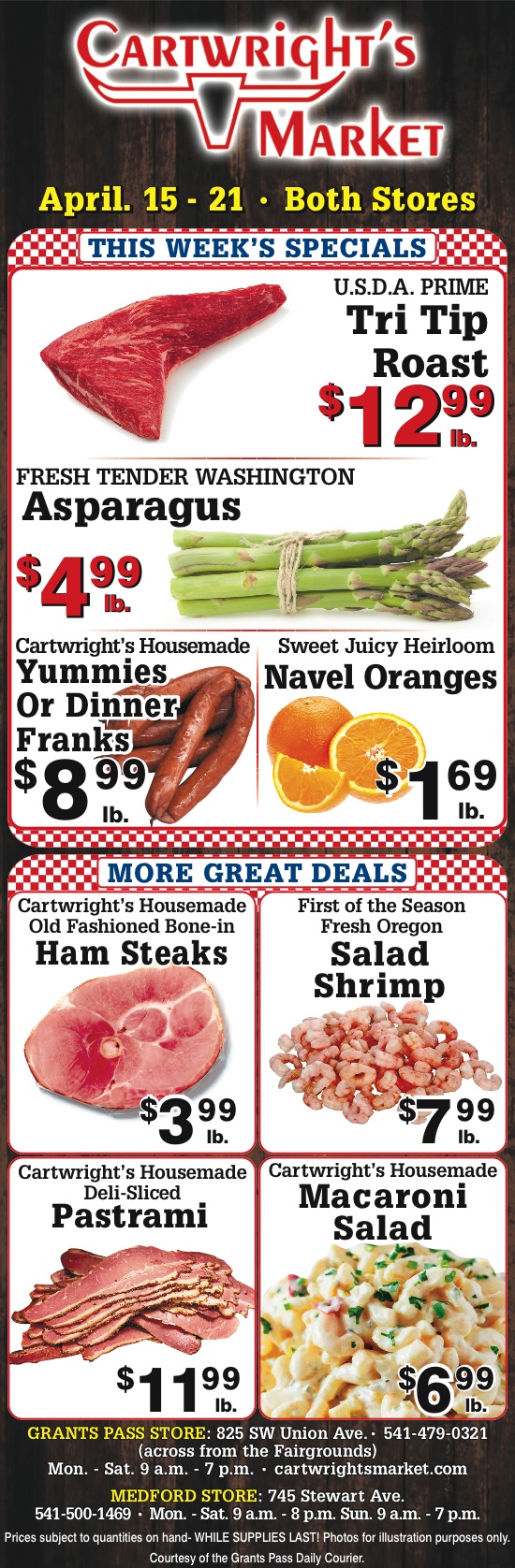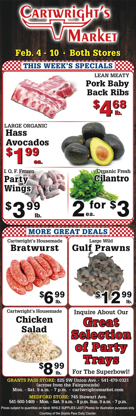 Cartwright’s Market is a leading fresh meat, produce and specialty market in Grants Pass, OR. We offer a wide variety of the freshest beef, pork, chicken and smoked meats in our 64-foot meat case. We also offer delicious, fresh seafood that is perfect for any occasion.